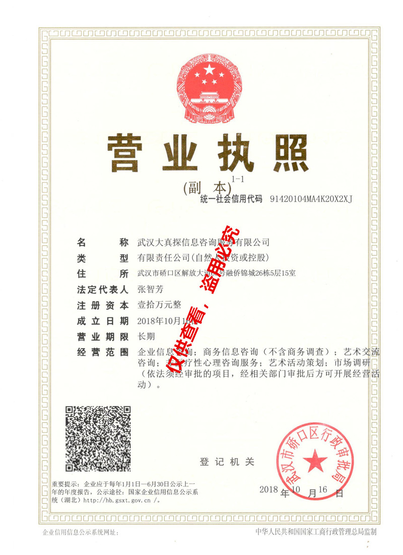 武漢大真探信息咨詢服務有限公司,是一家經國家工商注冊成立的正規合法公司,主要為各類客戶提供婚姻咨詢、背景咨詢、情感咨詢、市場調研咨詢等商業信息咨詢服務。實力雄厚、設備先進,自成立以來始終以服務客戶的合法權益為宗旨,本著認真負責、合理合法、實事求是、誠信保密、專業規范的工作理念,為各類客戶提供一流的調查工作和服務,成立至今已出色的完成了眾多客戶的委托,取得了驕人的業績,得到了廣大客戶的認可,在同行中有較高的聲譽。秉承“誠信第一,客戶至上”的理念,竭誠為各大企業、個人提供滿意服務。